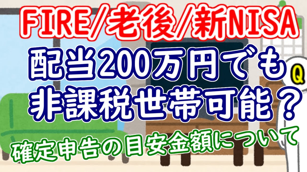 そのため、FIREや老後に収入がない状態で配当金の確定申告をする目安としては、配当金が住民税非課税世帯の45万円ではなく、健康保険料の43万円以下の場合となります。税金をおさえたければ住民税非課税世帯の条件だけでなく、国民健康保険料の基礎控除43万円以下にしておく必要があるのですね。